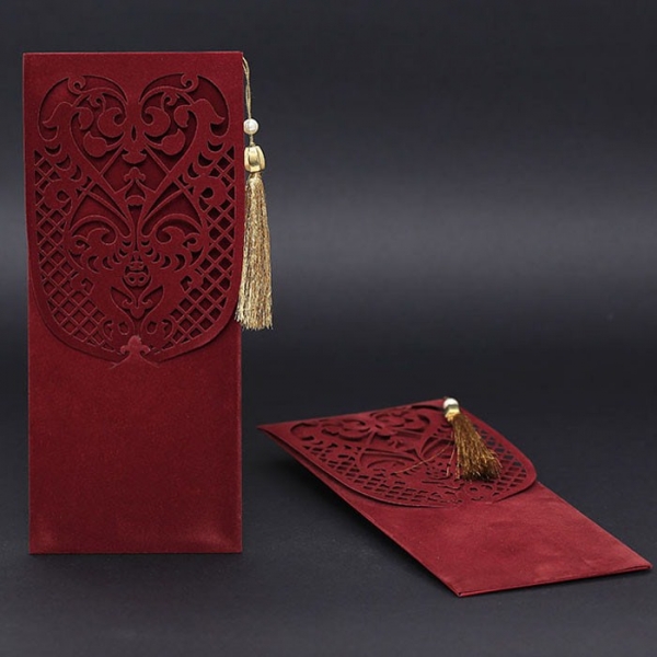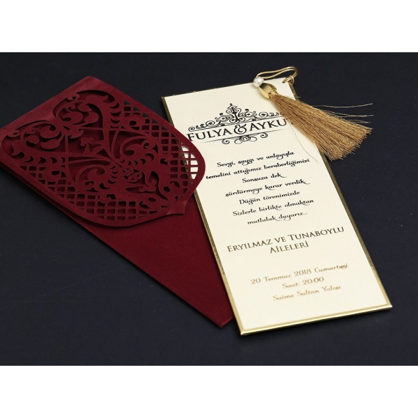 | Özellikleri | Davetiye Borda renginde ve kadife zarfı olan bir modeldir. Bilgilerin yer aldığı kağıt altın varaktır. ayrıca üzerine püskül takılır. |