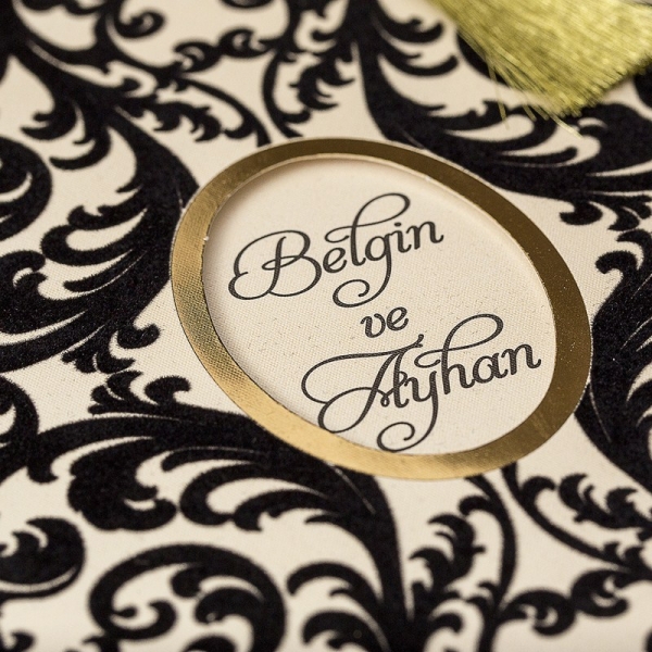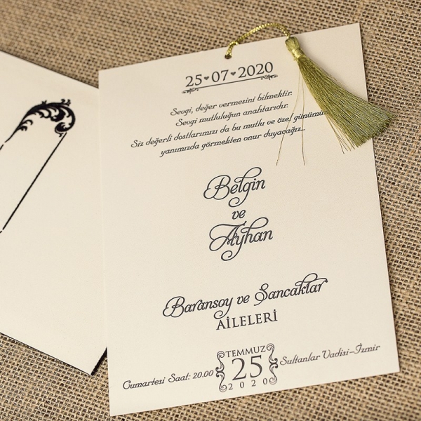 | Açıklama | Davetiye üsttten çekmeli bir modeldir. Davetiyenin üzerindeki siyah yerler kafife kaplamadır. Ayrıca püskülü gönderilmektedir. |