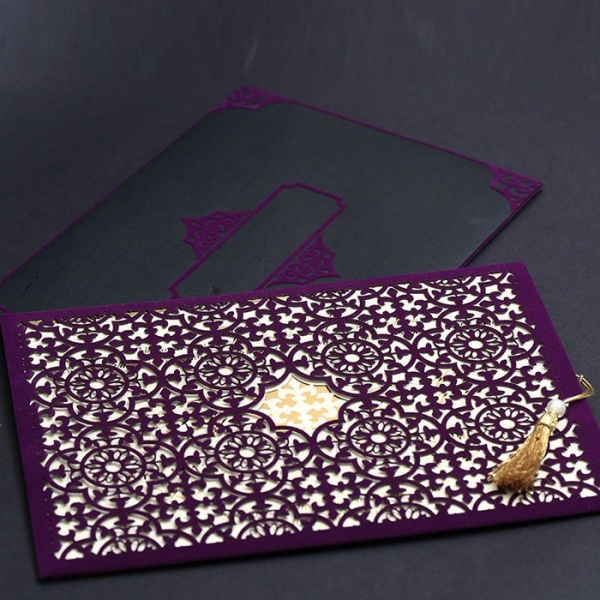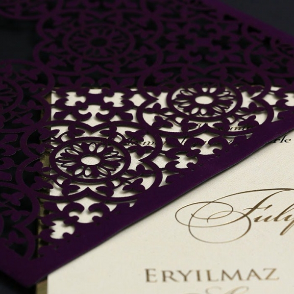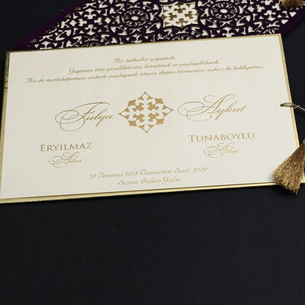 | Özellikleri | Davetiye Krem renklerde kadife zarfı olan lazer kesimli bir modeldir. Bilgilerin yer aldığı kağıt altın klişedir ayrıca kalın mukavvalı olup altın sarısı püskülü vardır. |