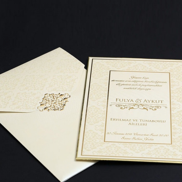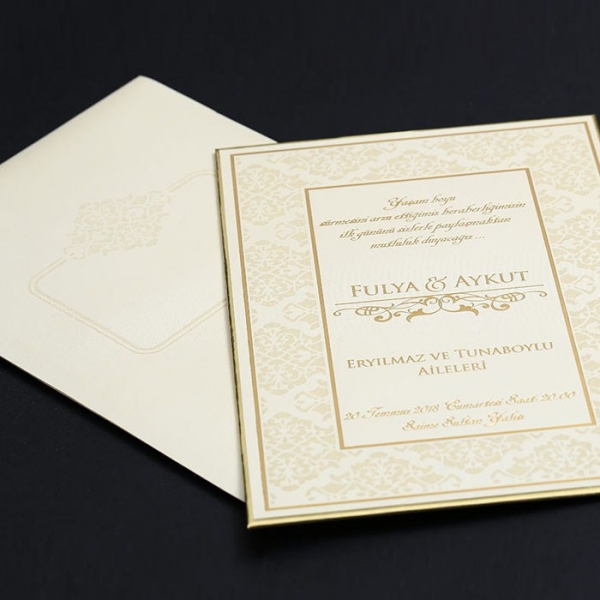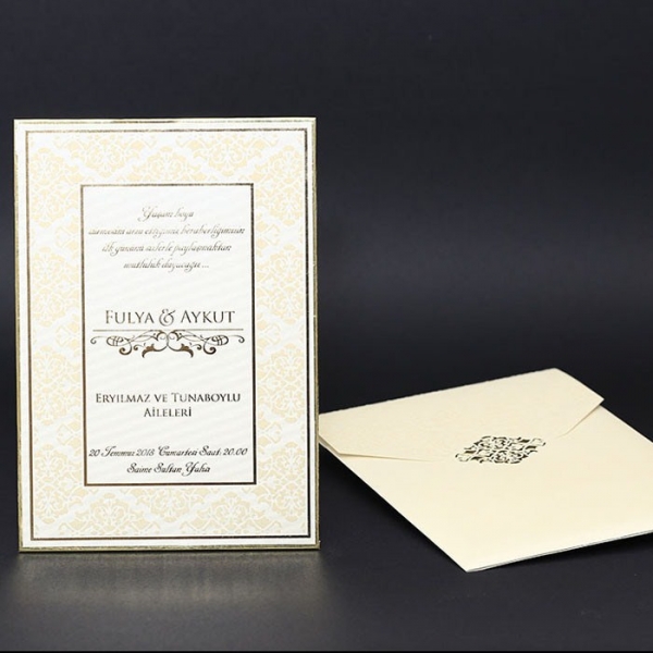 | Özellikleri | Davetiye Krem renklerde kadife kabartmalı zarfı olan bir modeldir. Bilgilerin yer aldığı kağıt kadife dokulu olup kalın mukavvadır. altın klişe yazıları bulunmaktadır. |