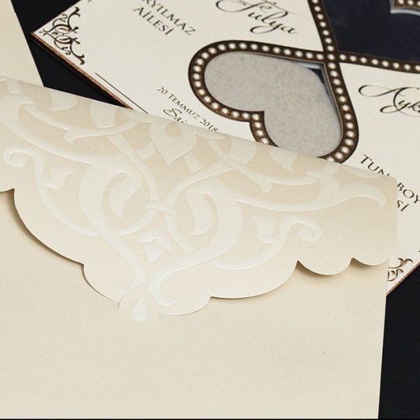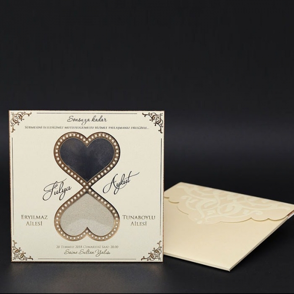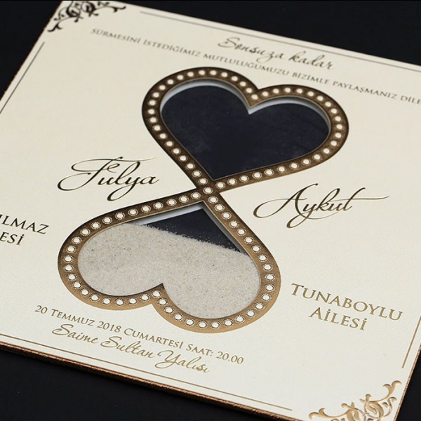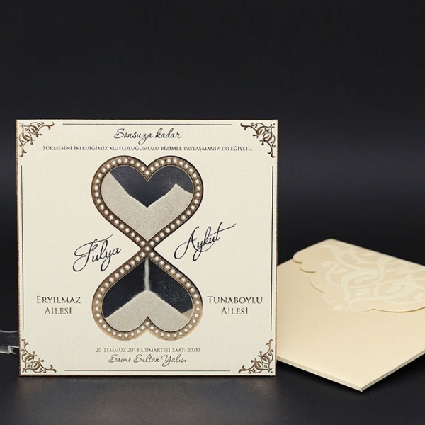 | Özellikleri | Davetiye Krem tonlarında altın yaldız desenli bir modeldir. Bilgilerin yer aldığı kağıt kalın mukavva olup ortasında Pvc'den Kum Saati oluşmaktadır. |