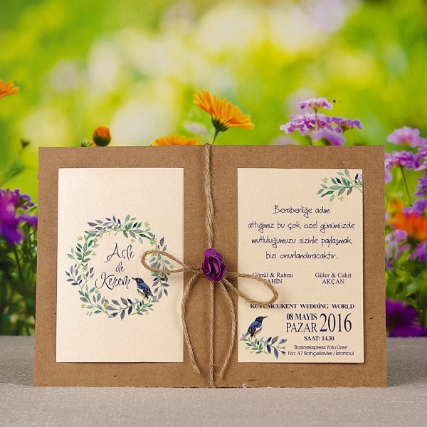 | Açıklama | Retro Davetiye 314 eskitme kraft kağıttan yapılmış olup mor çiçek ile süslenmiştir. Bilgilerin yer aldığı kağıt tek parça olup kraft kağıt içine takılmaktadır. Davetiye ekranda görüldüğü şekilde olup katlanmamaktadır. İp ve çiçek birleşmemiş olarak gönderilmektedir. |