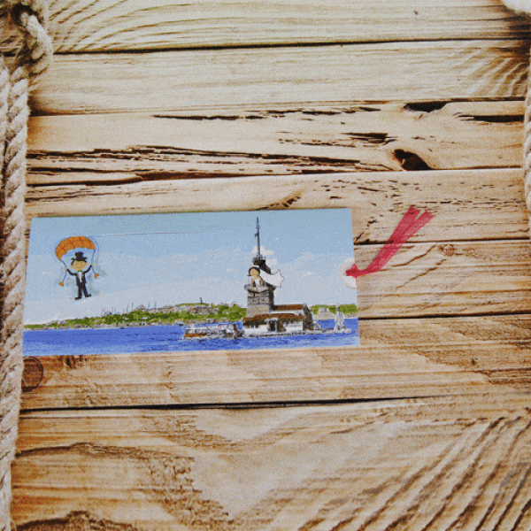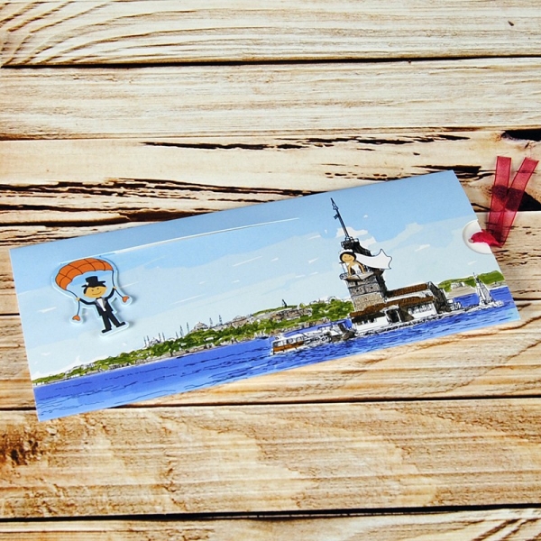 Açıklama Retro Davetiye 333 modelinde bilgilerin yer aldığı kağıt sağdan çekildiğinde balonla uçan damat kız kulesindeki geline doğru gitmektedir.