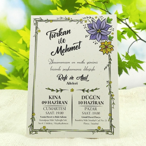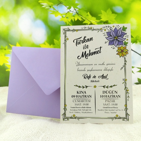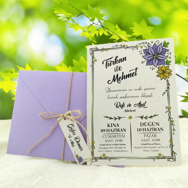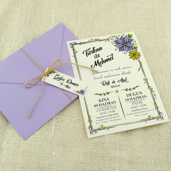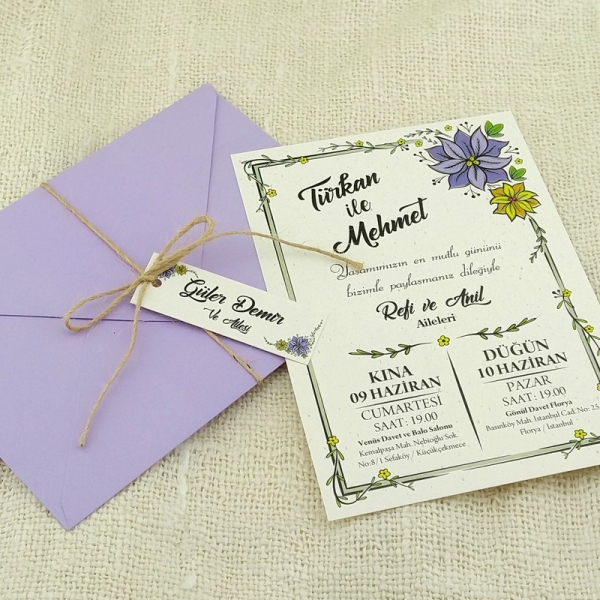 | Açıklama | Retro Davetiye 343 İsim etiketi ve hasır ip ve mor zarf ile gönderilmektedir. |