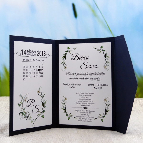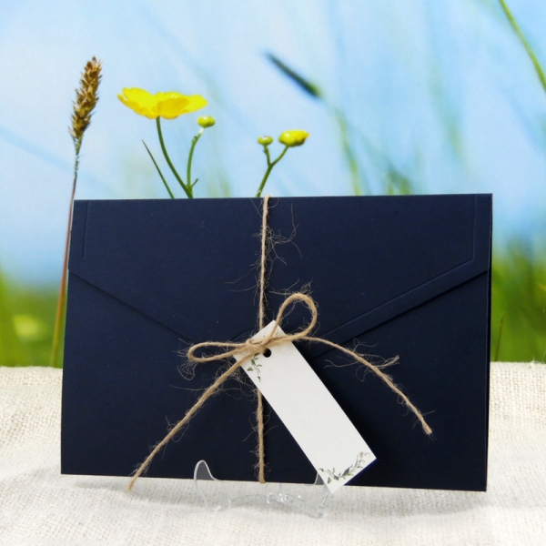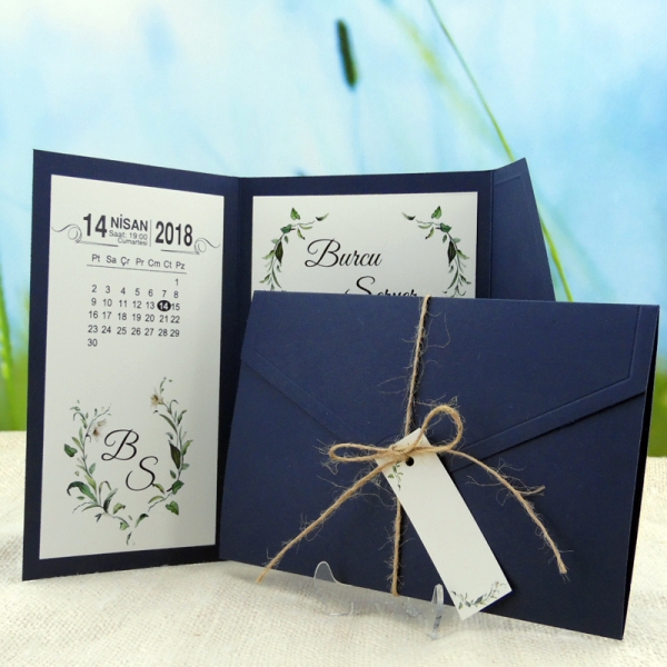 | Açıklama | Retro Davetiye 354 koyu lacivert zarflı, hasır ip ve isim etiketi bir davetiye modelidir. |