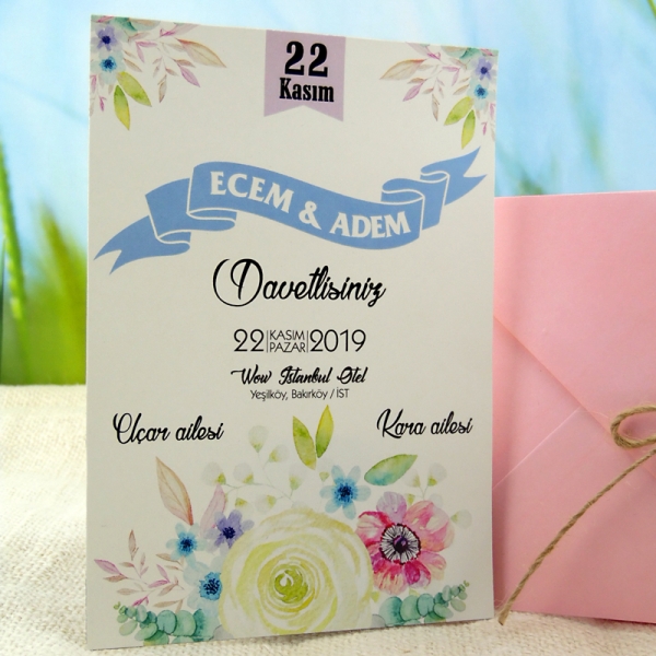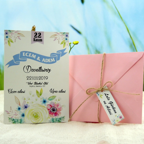 Açıklama Retro Davetiye 355 pembe zarflı, hasır ip ve isim etiketi bir davetiye modelidir.