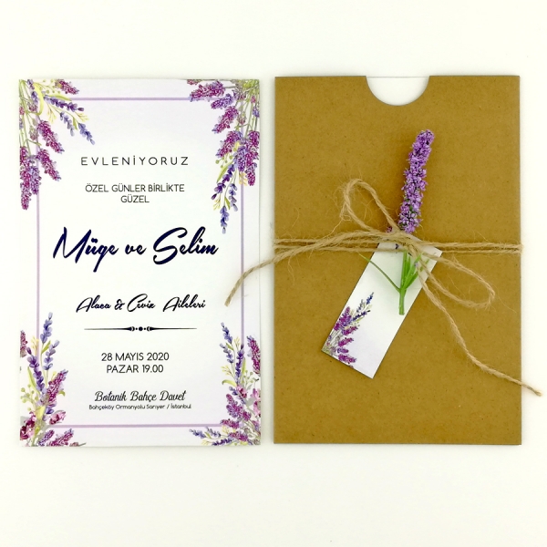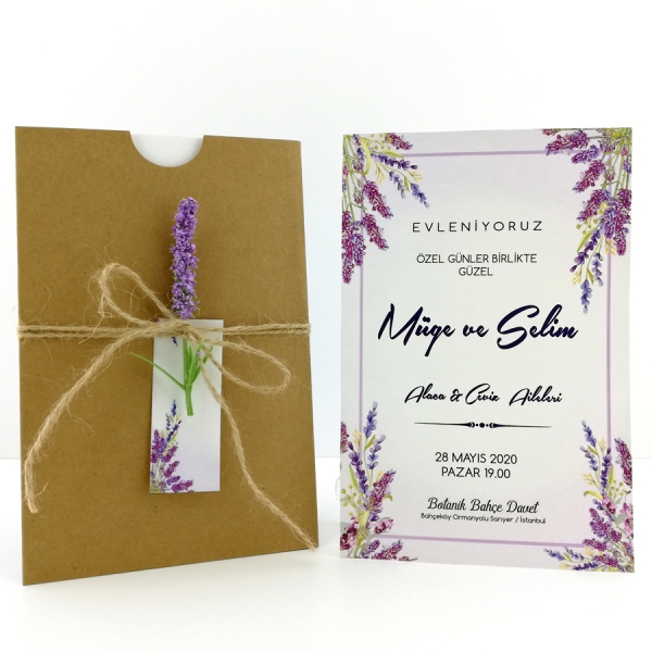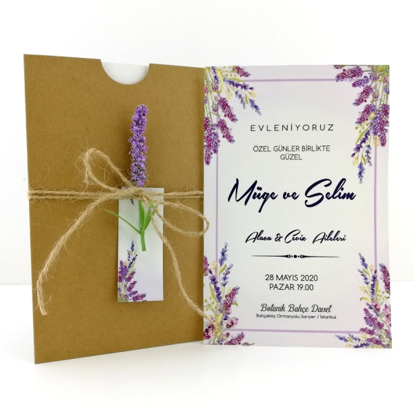 | Açıklama | Retro Davetiye 382 kraft eskitme kağıt zarfl bir davetiye modeli olup lavanta desenli ve yapay lavanta çiçeği bulunan bir davetiye modelidir. |