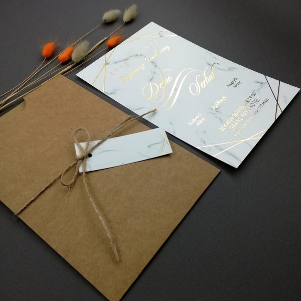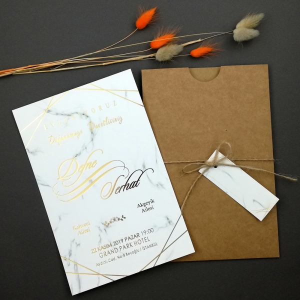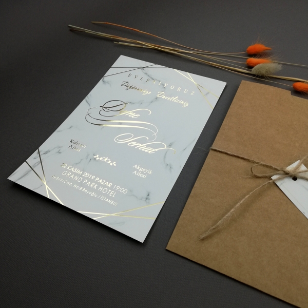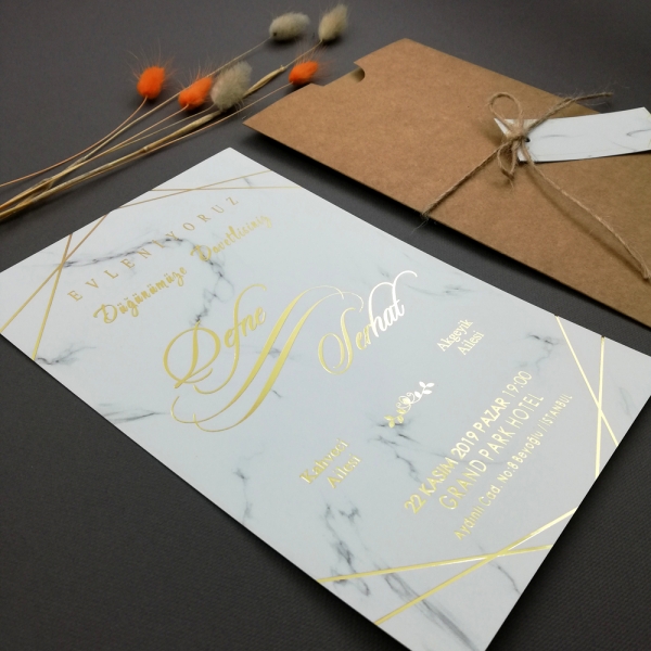 | Açıklama | Klişe baskı ücreti 1 kez toplam davetiye fiyatına eklenmektedir. Retro Davetiye 396 kişiye özel altın ve gümüş yaldız baskılı olarak hazırlanmaktadır. Kraft zarf isim etiketi ve hasır ip ile birlikte gönderilmektedir. |