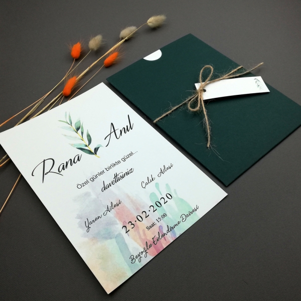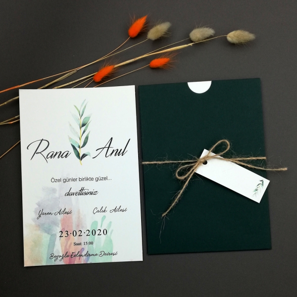 | Açıklama | Retro Davetiye 423 koyu yeşil zarf, hasır ip ve isim etiketi ile birlikte gönderilmektedir. |