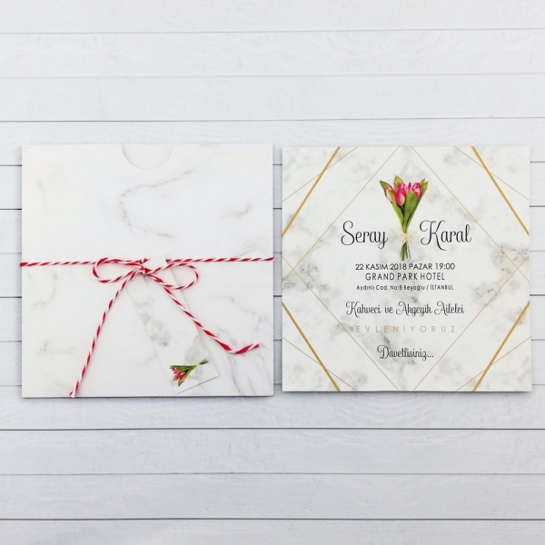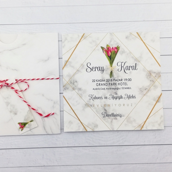 | Açıklama | Retro Davetiye 425'in zarfı ve bilgilerin basıldığı kağıt mermer deseni basılmış kağıttır. Zarfı kalın kağıttan yapılmıştır. |