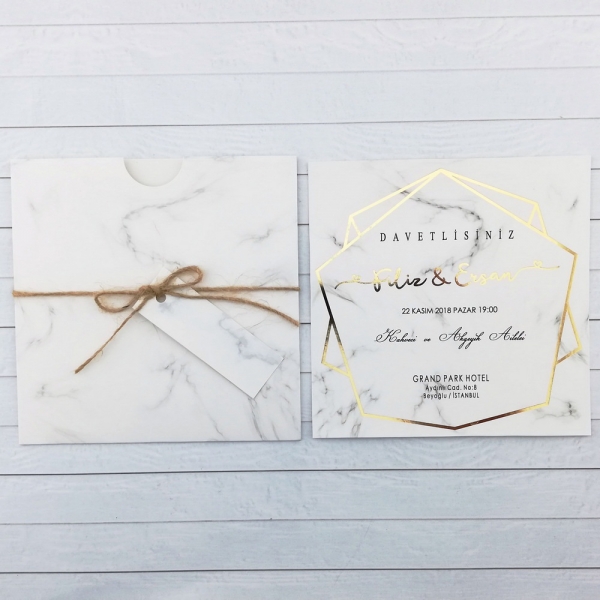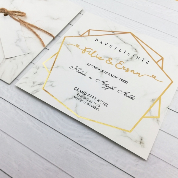 | Açıklama | Retro Davetiye 428'in zarfı ve bilgilerin basıldığı kağıt mermer deseni basılmış kağıttır. Zarfı kalın kağıttan yapılmıştır. Davetiyede çerçeve ve isimler klişe altın yaldız baskıdır. Seçeneklerden ofset boya baskı seçtiğinizde bu alanlar aynı renkte boya olarak basılacaktır. |