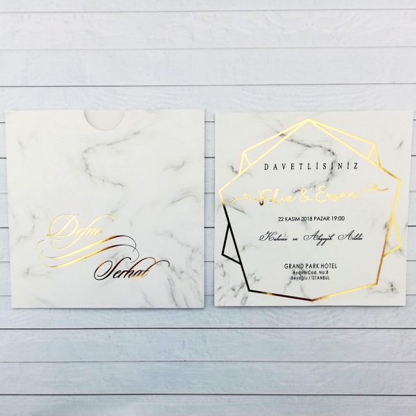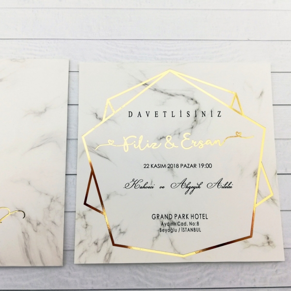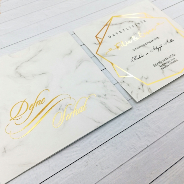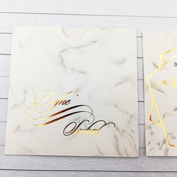 Açıklama Retro Davetiye 429'in zarfı ve bilgilerin basıldığı kağıt mermer deseni basılmış kağıttır. Zarfı kalın kağıttan yapılmıştır. Davetiyede çerçeve ve isimler klişe altın yaldız baskıdır. Seçeneklerden ofset boya baskı seçtiğinizde bu alanlar aynı renkte boya olarak basılacaktır.