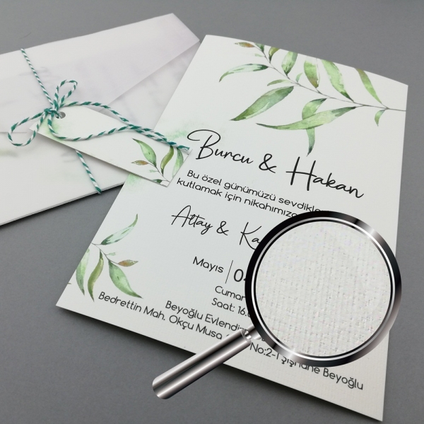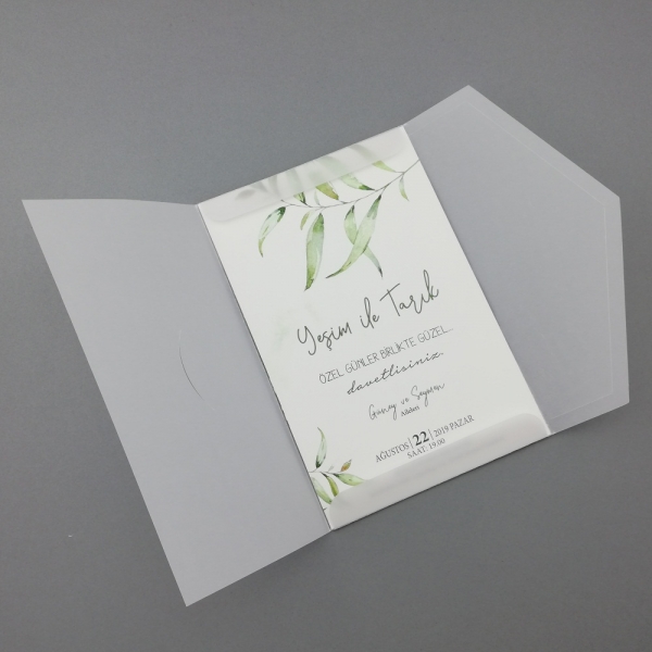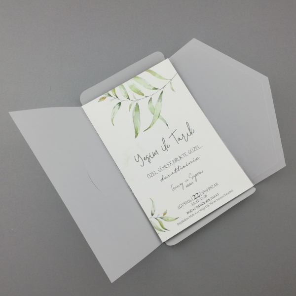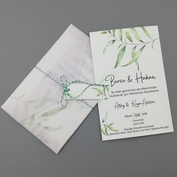 Açıklama Retro Davetiye 470'in zarfı şeffaf aydınger kağıttan yapılmıştır. Davetiye bilgilerinin basıldığı kağıt desenli kağıttır.