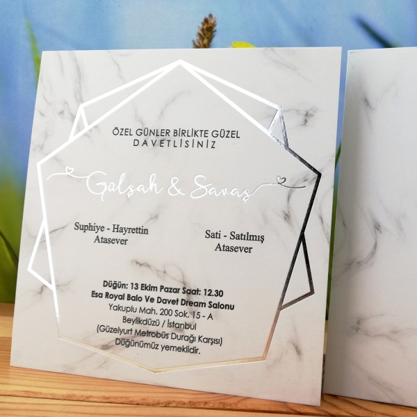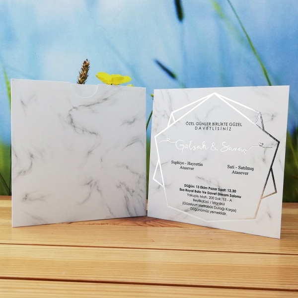 | Açıklama | Retro Davetiye 507'nin zarfı kalın gramajlı mermer desenli kağıttan yapılmıştır. |